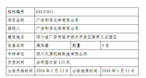 關(guān)于廣安利華化學(xué)有限公司不銹鋼凝華器設(shè)備公開招標采購結(jié)果公示: